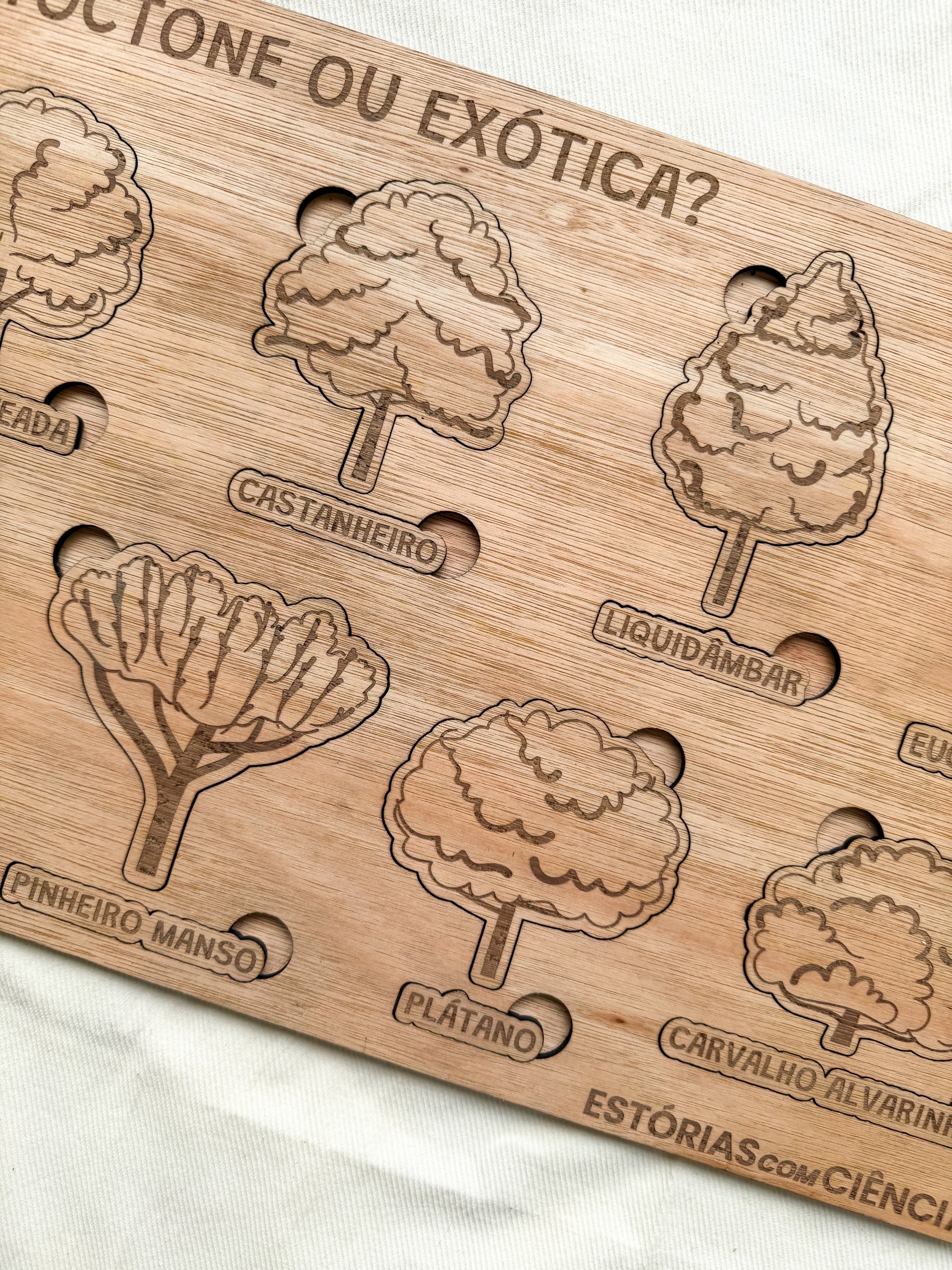 Com este puzzle em madeira, as crianças aprendem a distinguir espécies autóctones e exóticas, observando as formas das copas, troncos e folhas de cada árvore.