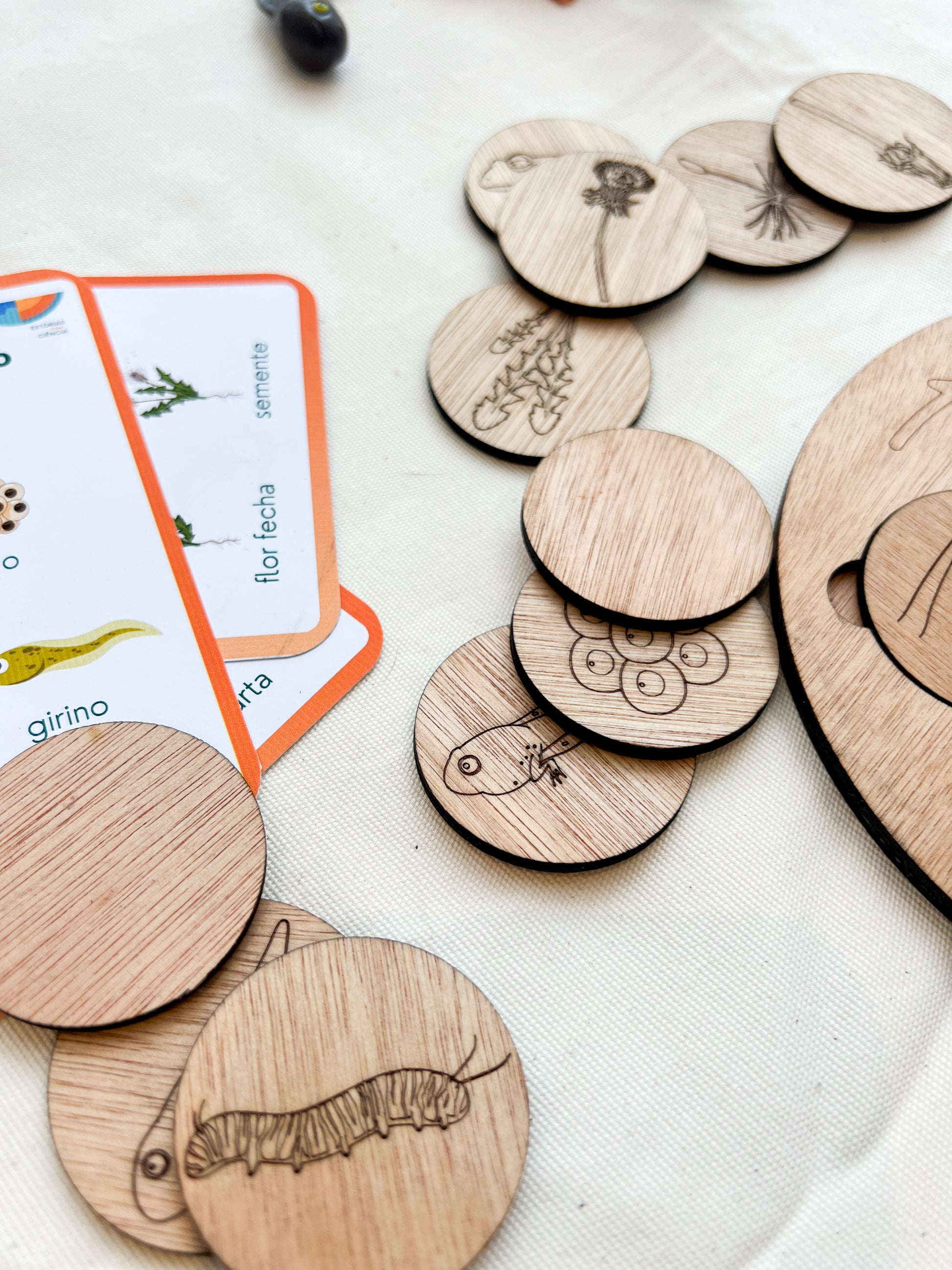 Cada conjunto é composto por uma placa de contraplacado de madeira certificada FSC, 4 ciclos de vida de madeira (borboleta, abelha, sapo e dente de leão) e por 4 cartões explicativos de cada um dos ciclos de vida