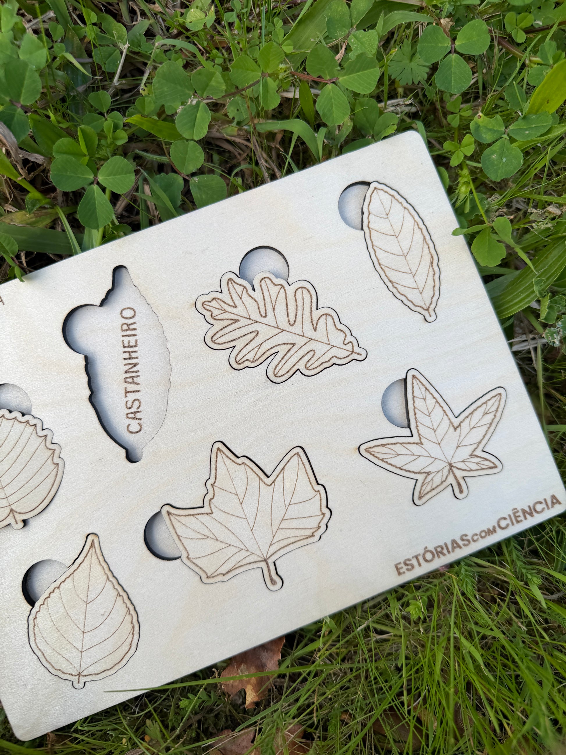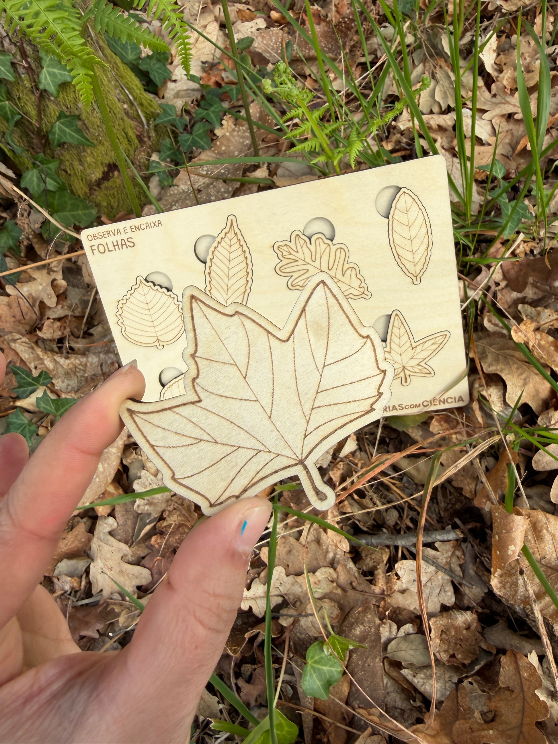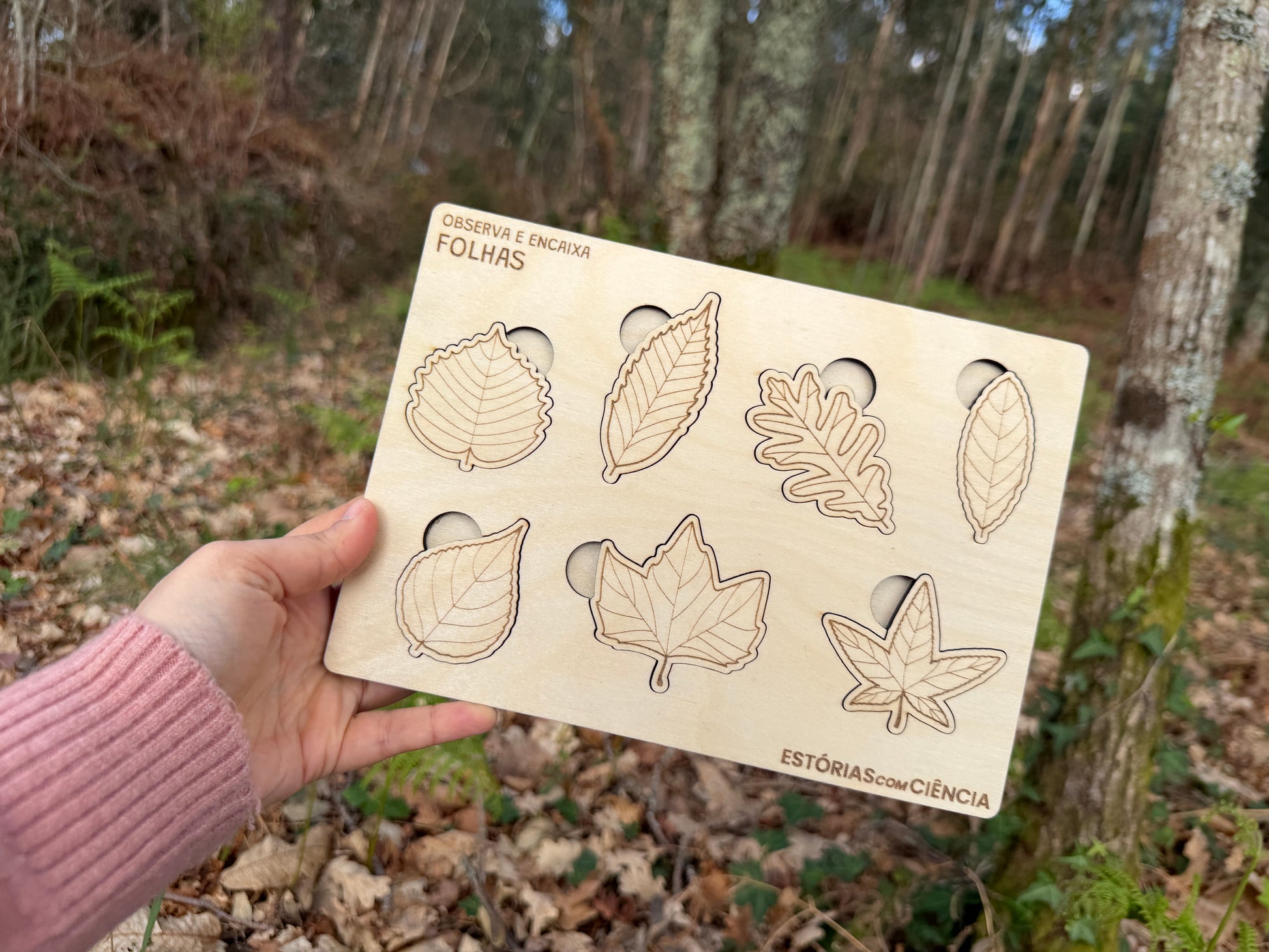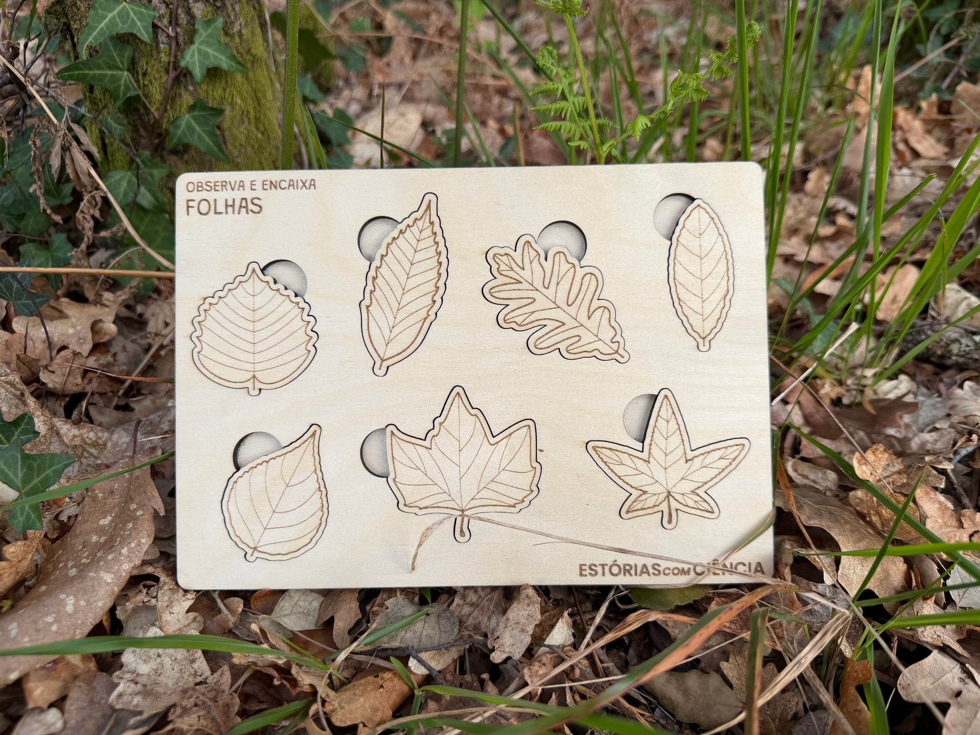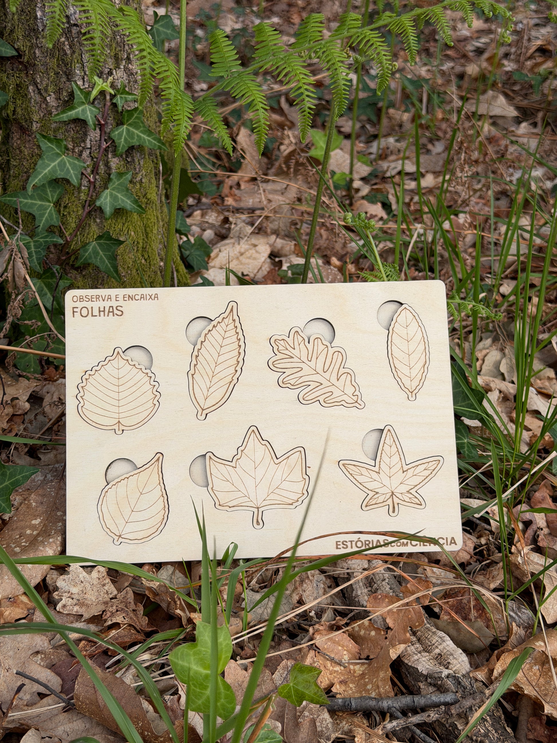 Com 7 folhas diferentes em madeira de bétula, as mãos pequenas aprendem a encaixar, a comparar, a observar. Cada peça tem o seu lugar — e cada lugar tem uma história para contar.